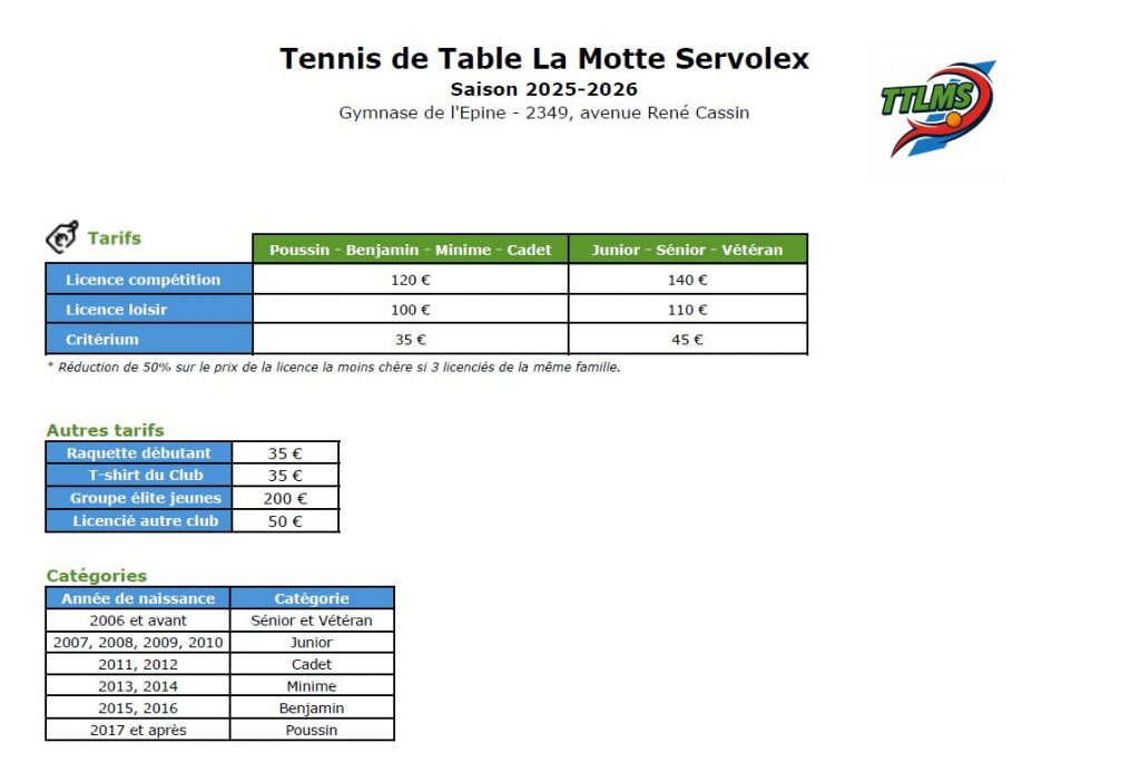 TARIFS SAISON 2025/2026